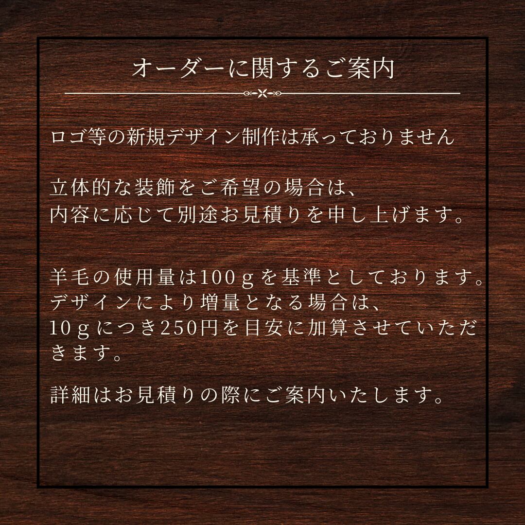 ※羊毛の使用量は100gを基準としております。デザインにより増量となる場合は、10gにつき250円を目安に加算させていただきます。
